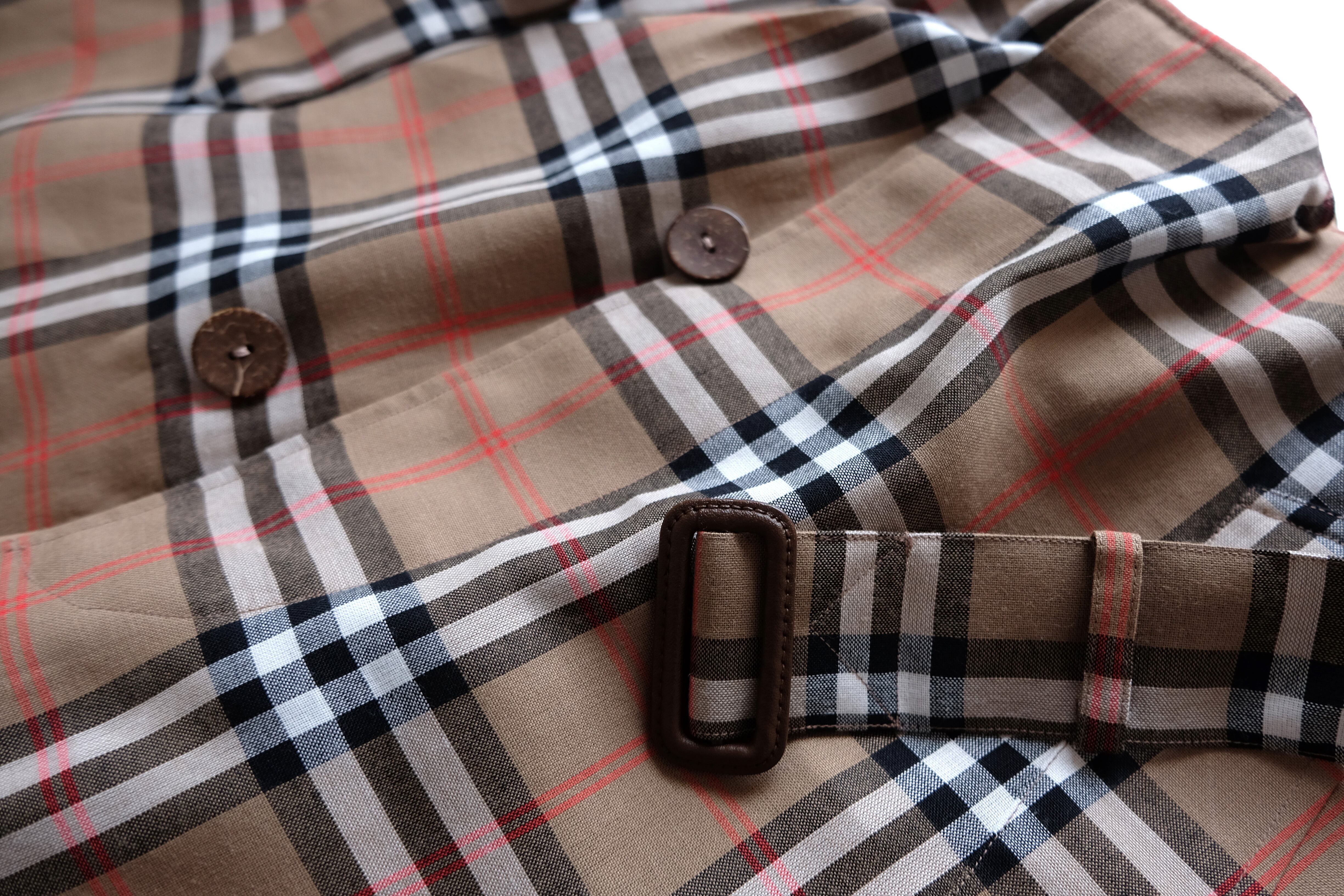シックな印象のベージュをベースに白黒タータン、ピンク・レッド・オレンジに変化するラインが効いたタータンチェック柄。大昔のmade in england なトレンチコートの裏地に使われていた様な生地です。