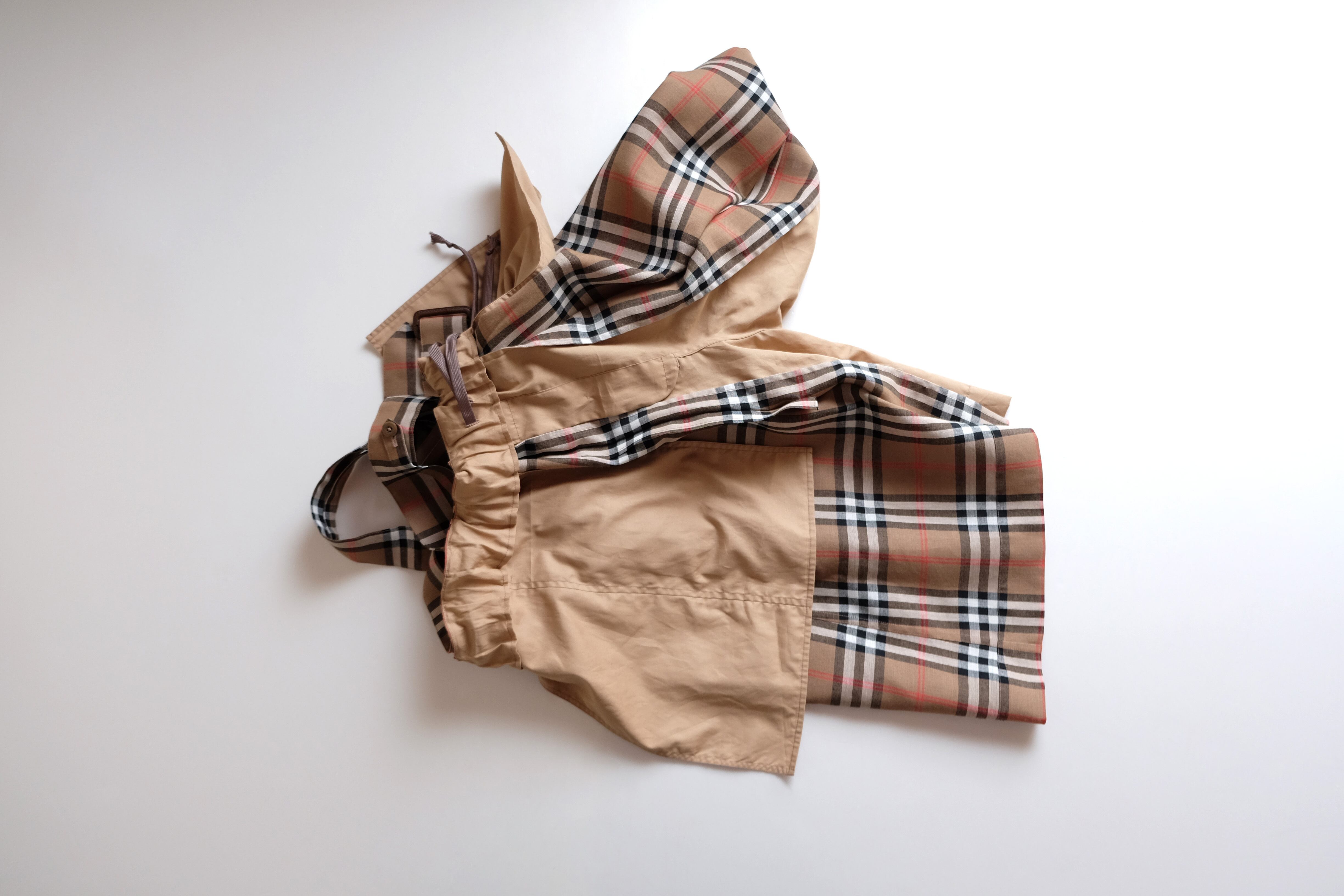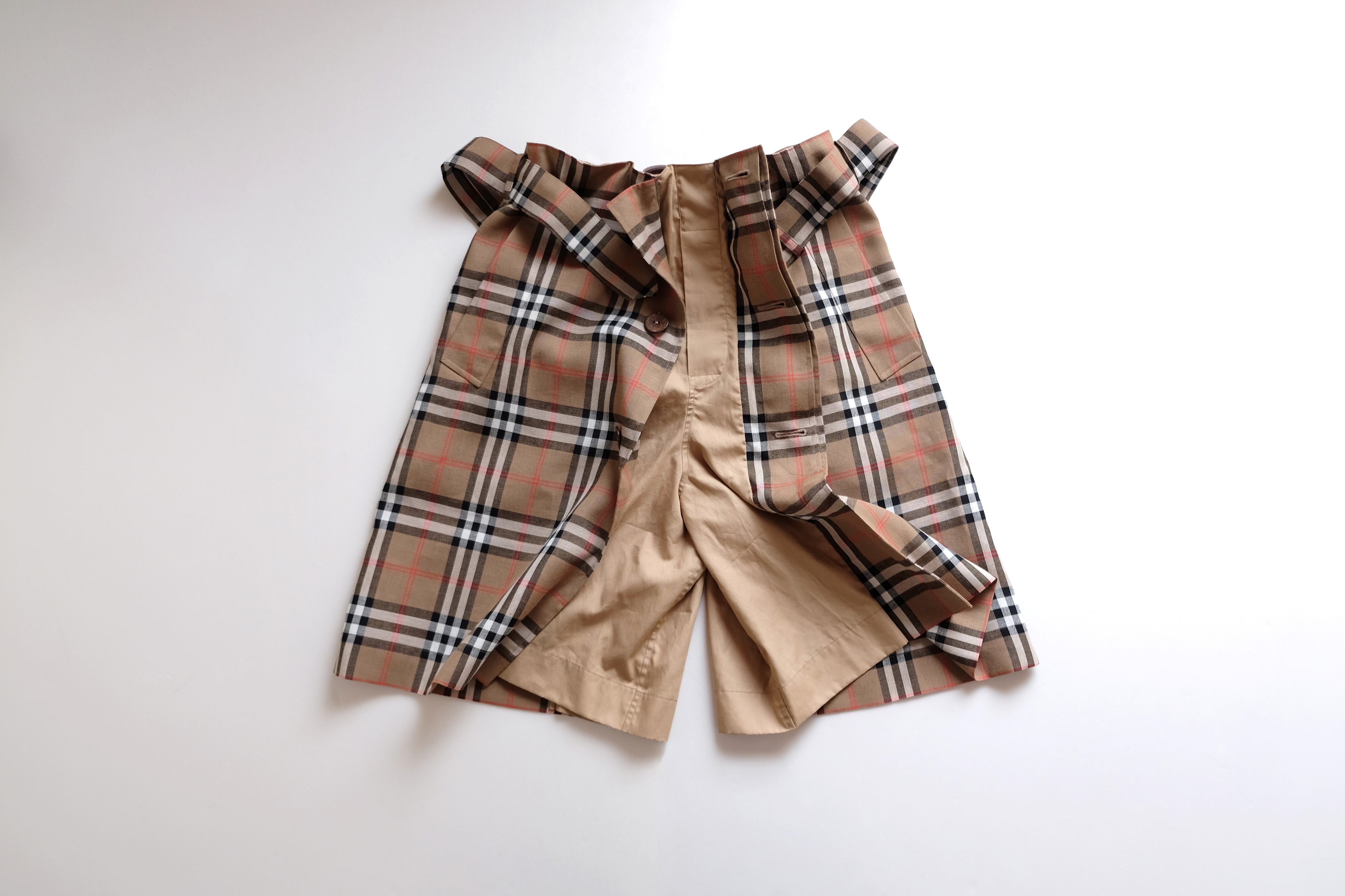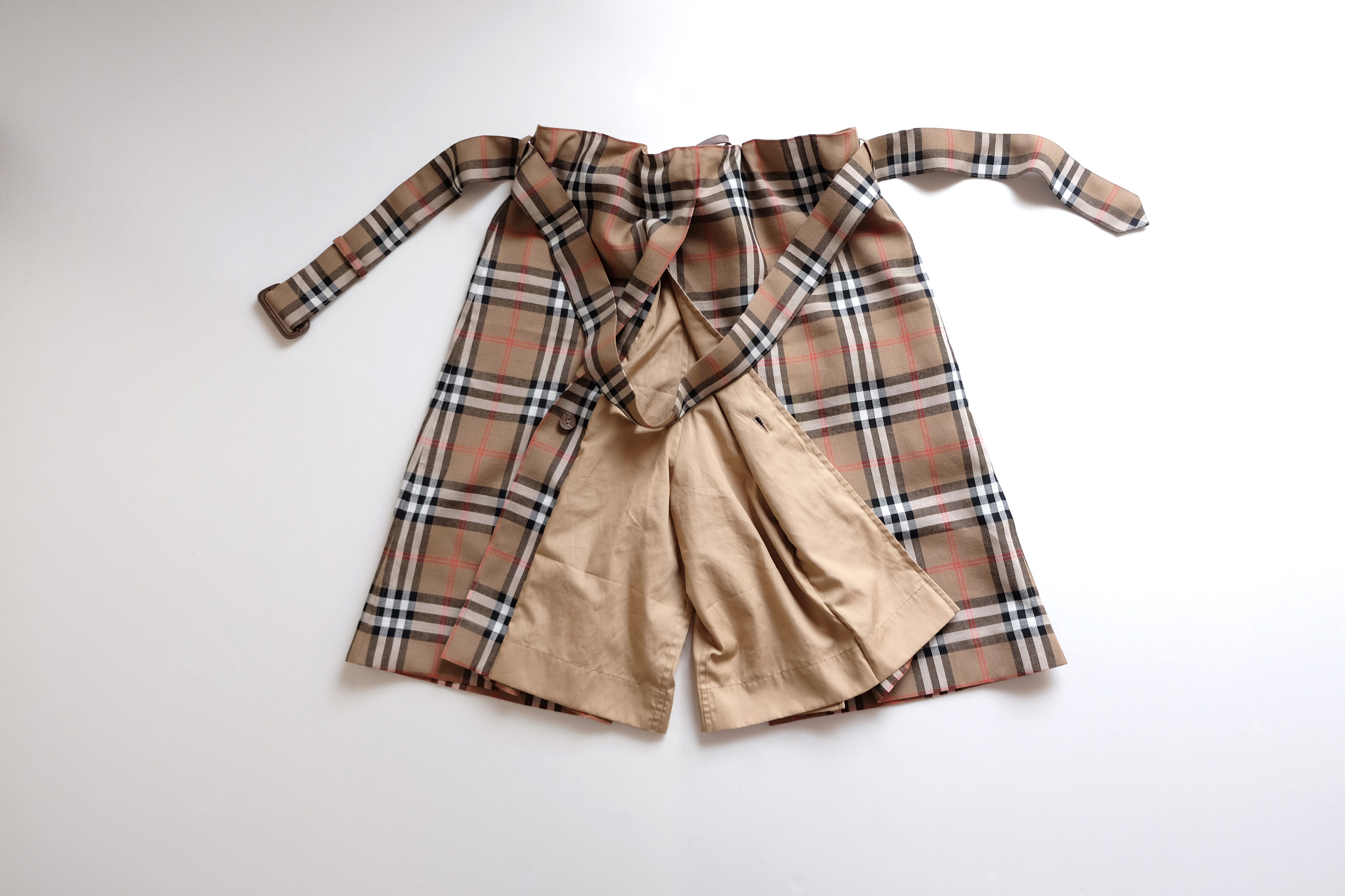 メンズMサイズ程度のステンカラーコートのディテールやサイズもそのままに、下だけ切り取り、キュロットパンツの様なショーツに仕立てました。