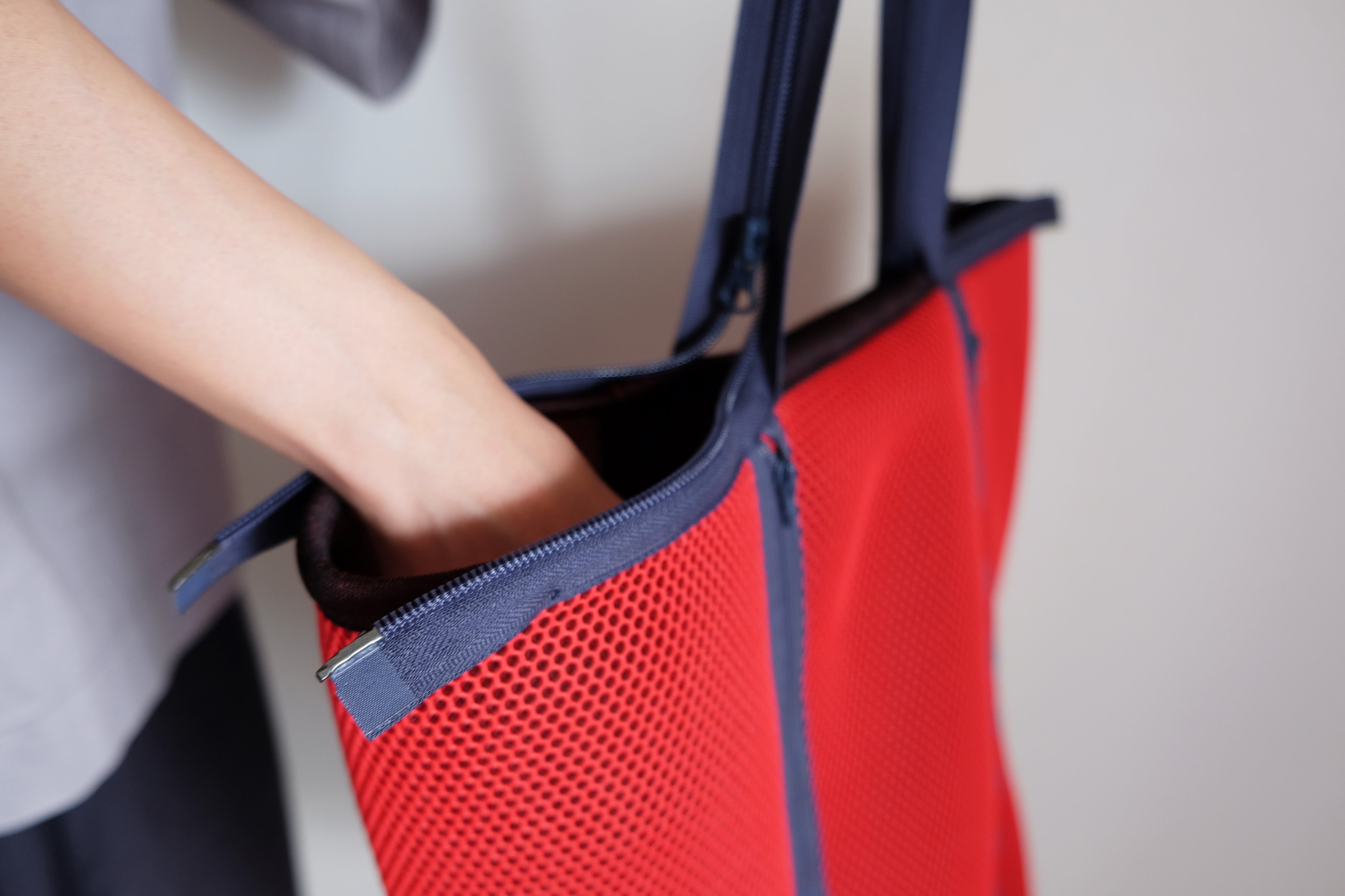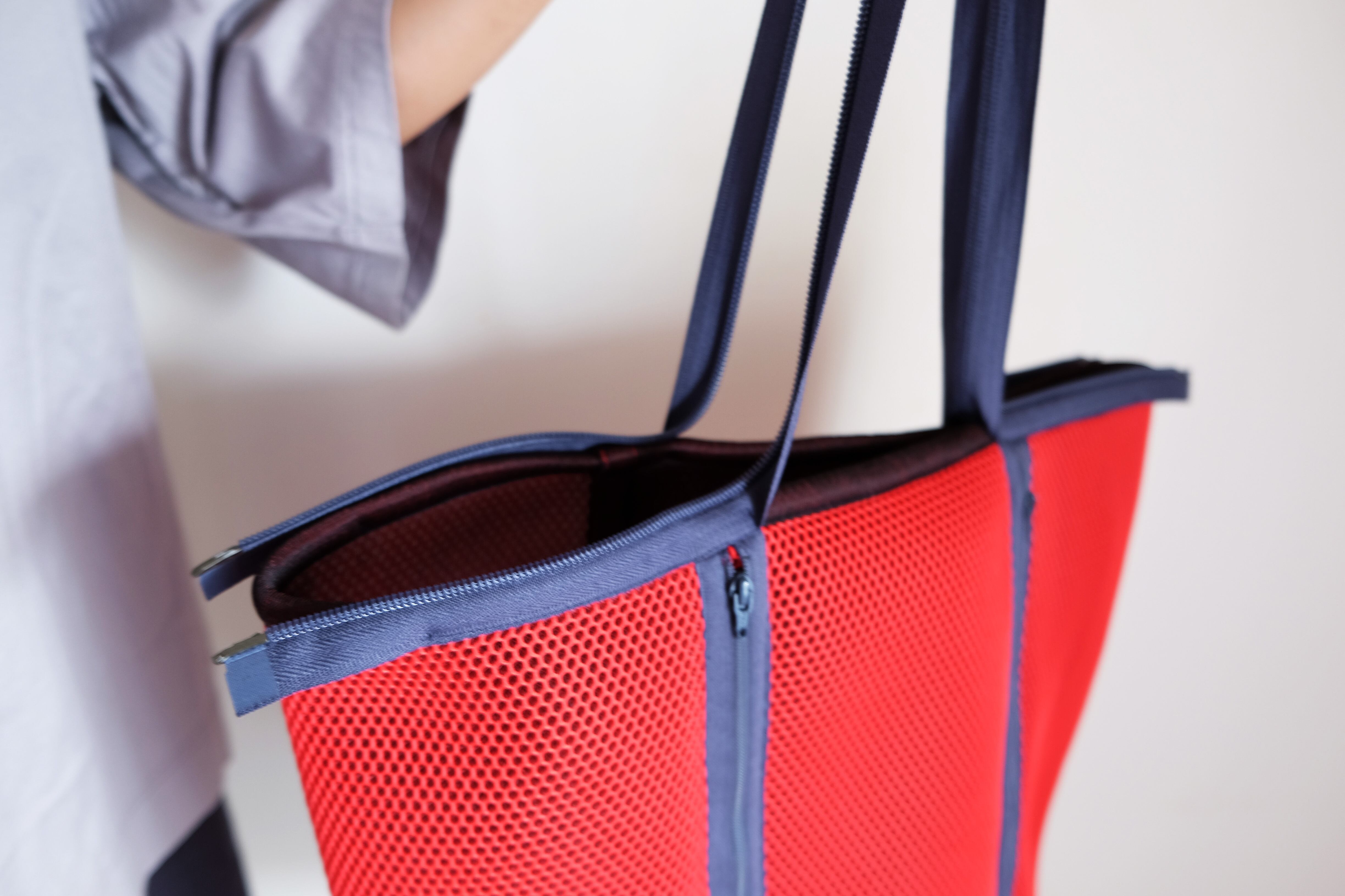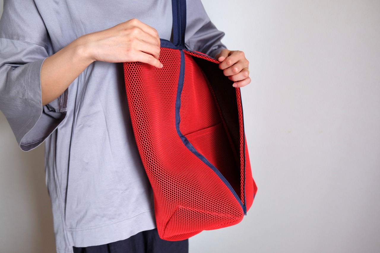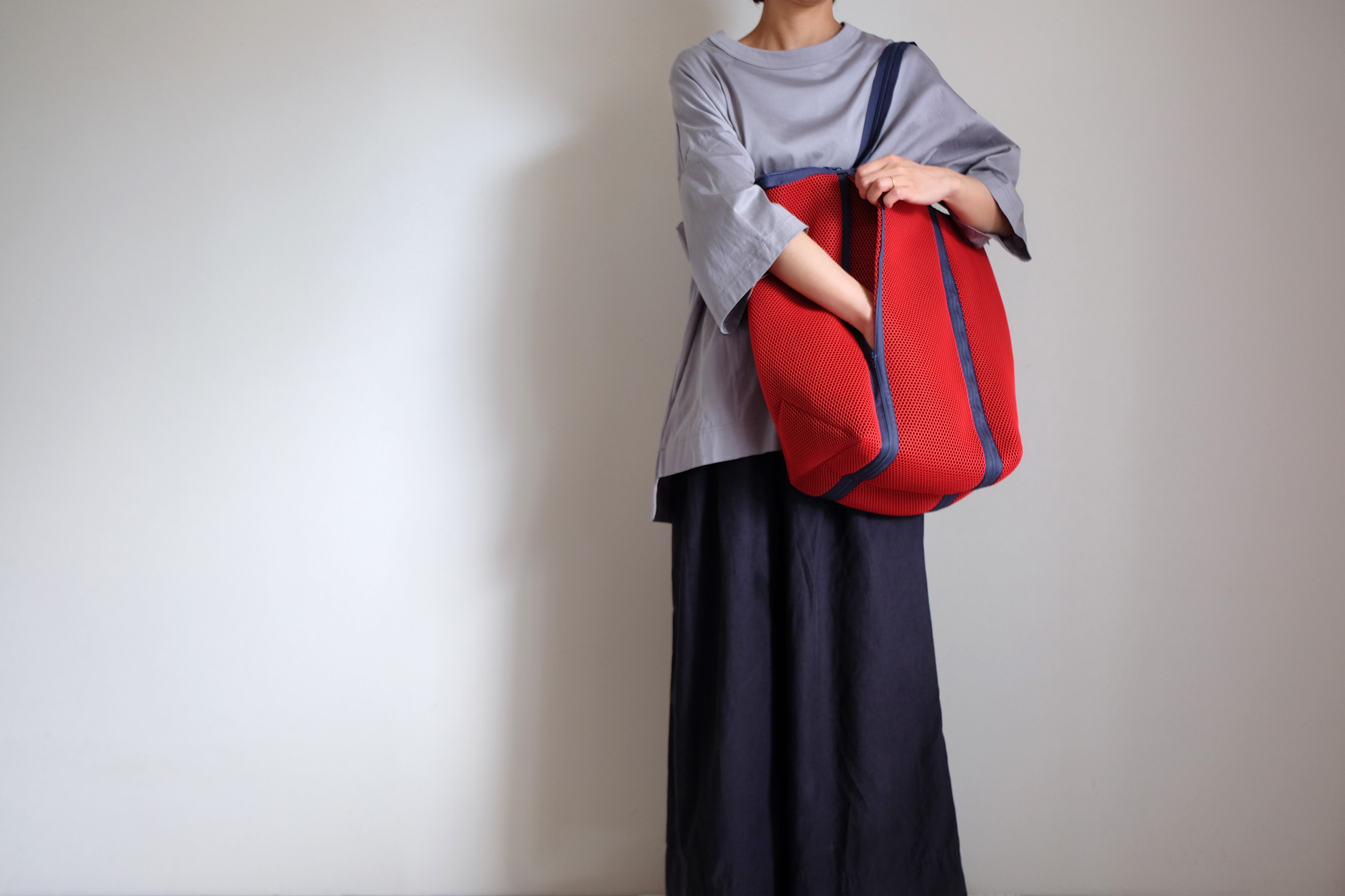 新作・軽量/ツートンカラーぷっくりかわいいポリメッシュ/ハニカム/肩掛けマチ付きバッグ/A4対応・大容量【ジップポケットジップトートバッグ/レッドブラック&グレイッシュネイビー】/ zip pocket zip tote bag / polyester mesh / honeycomb【 red black&grayish navy 】 | 1o(wano-/ワンオー)丁寧な手仕事・ファッション・帽子・服・プリントTシャツの通販