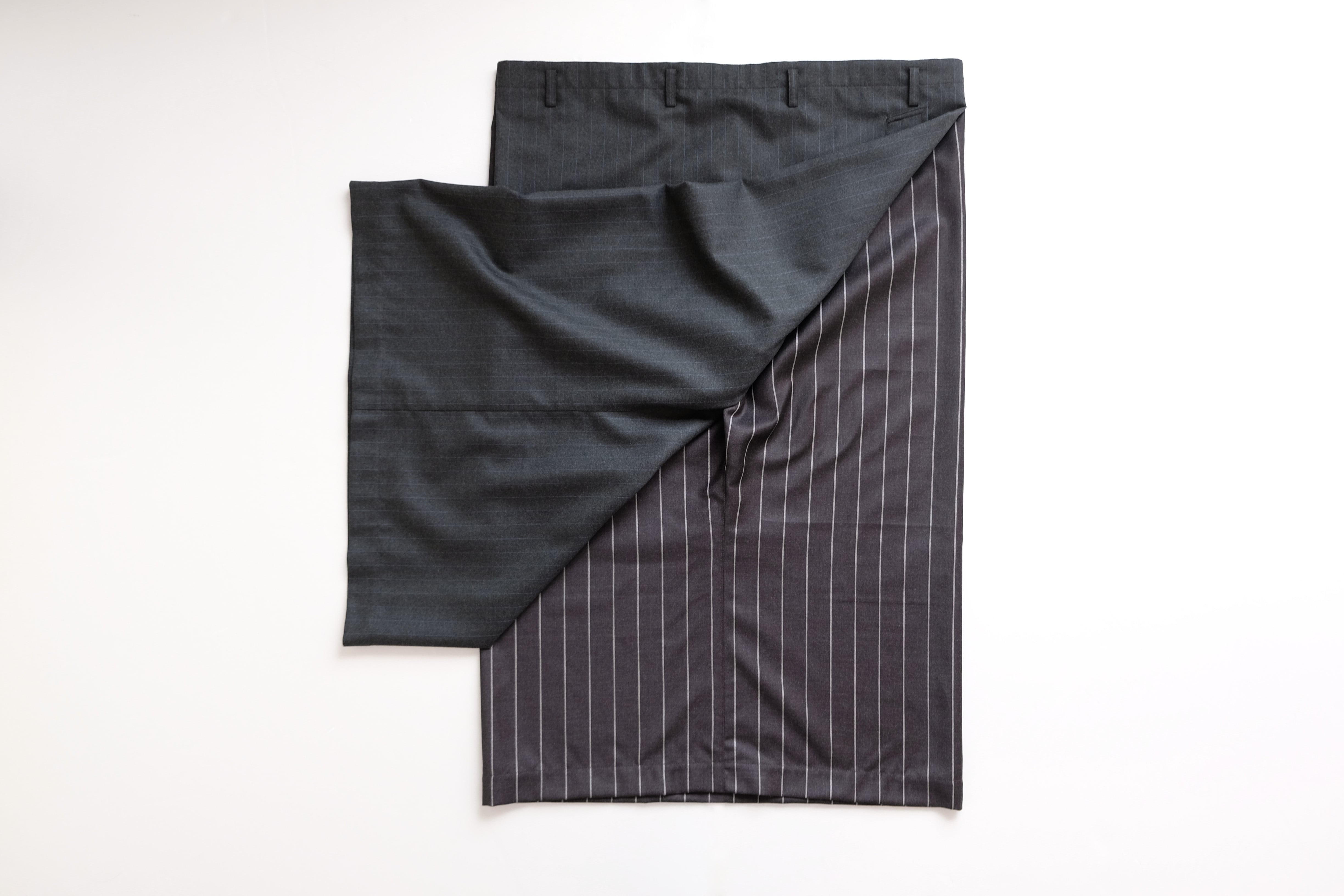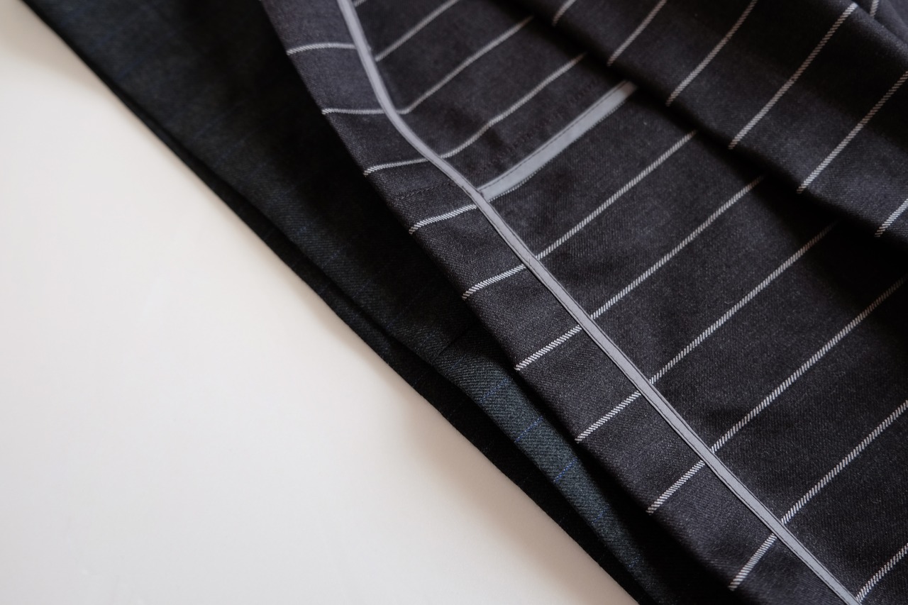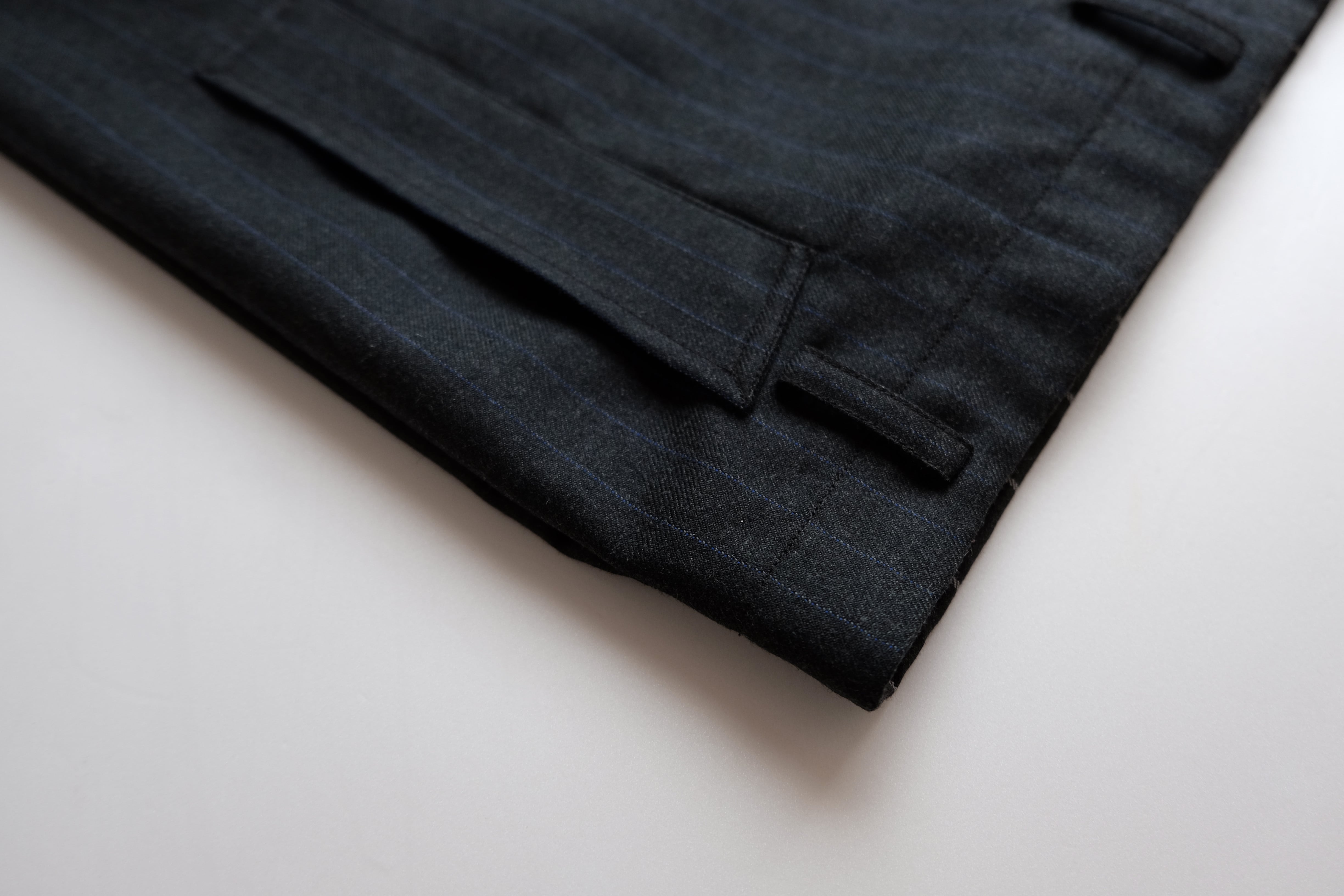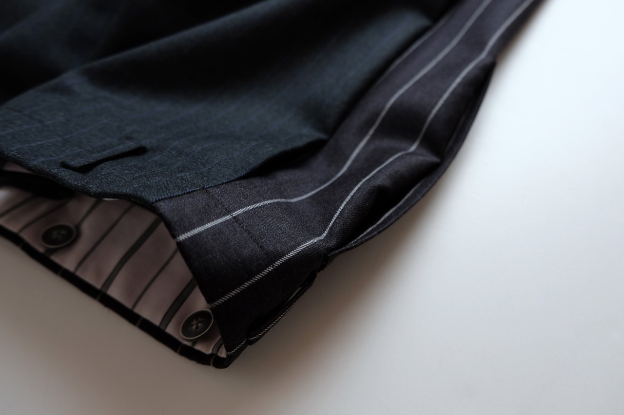 内側、折り伏せ縫い、パイピング、腰裏ハンドテーラーリング。