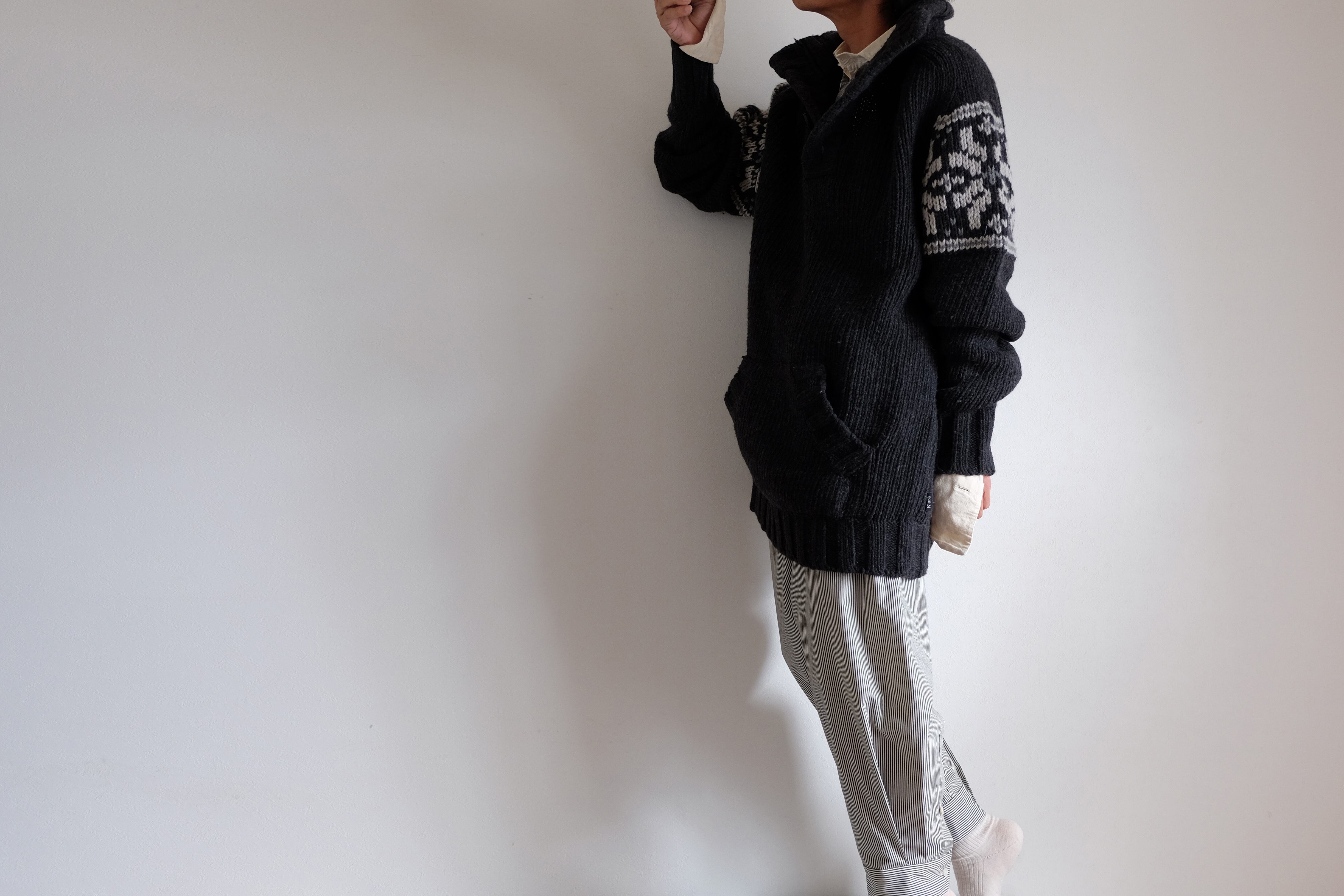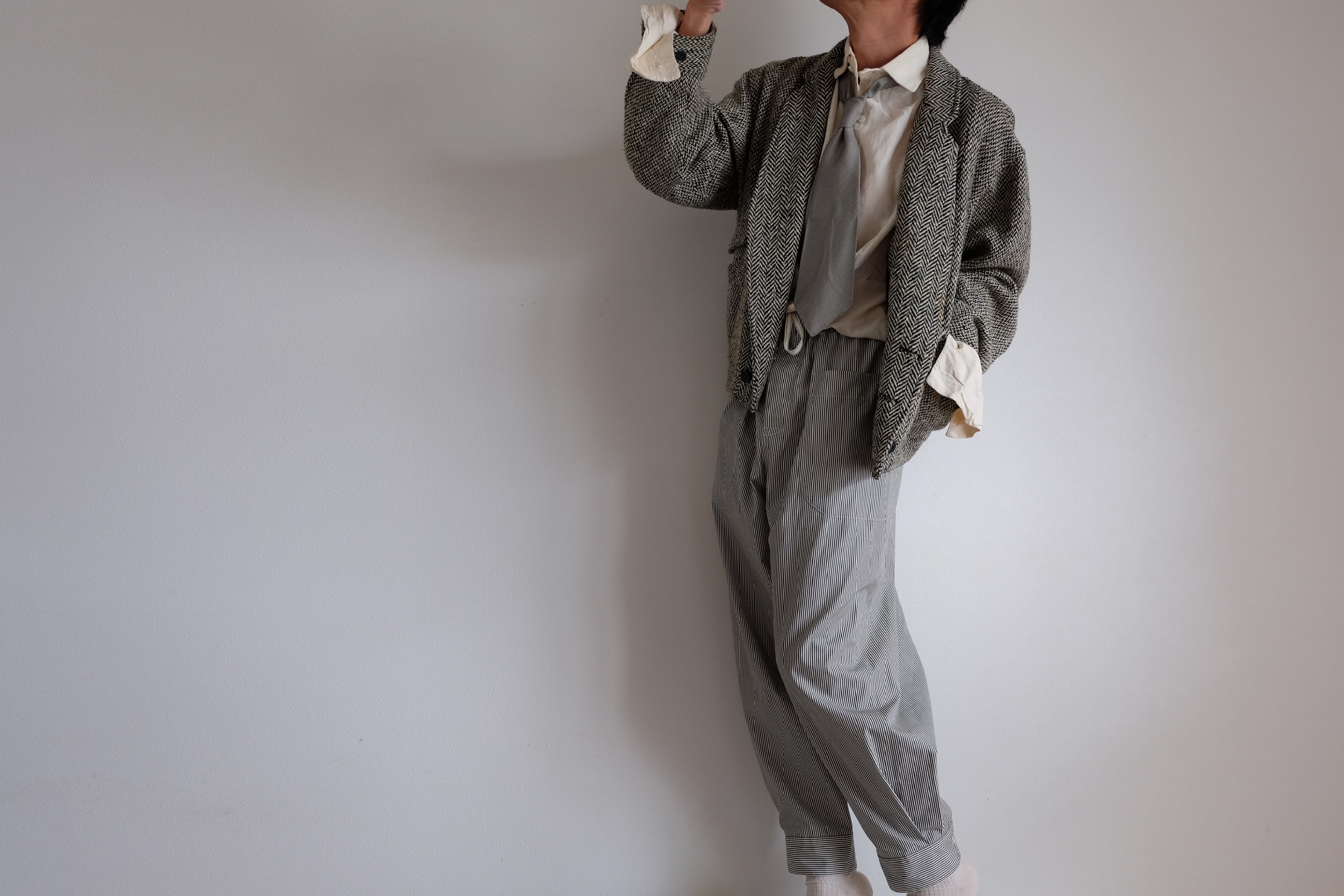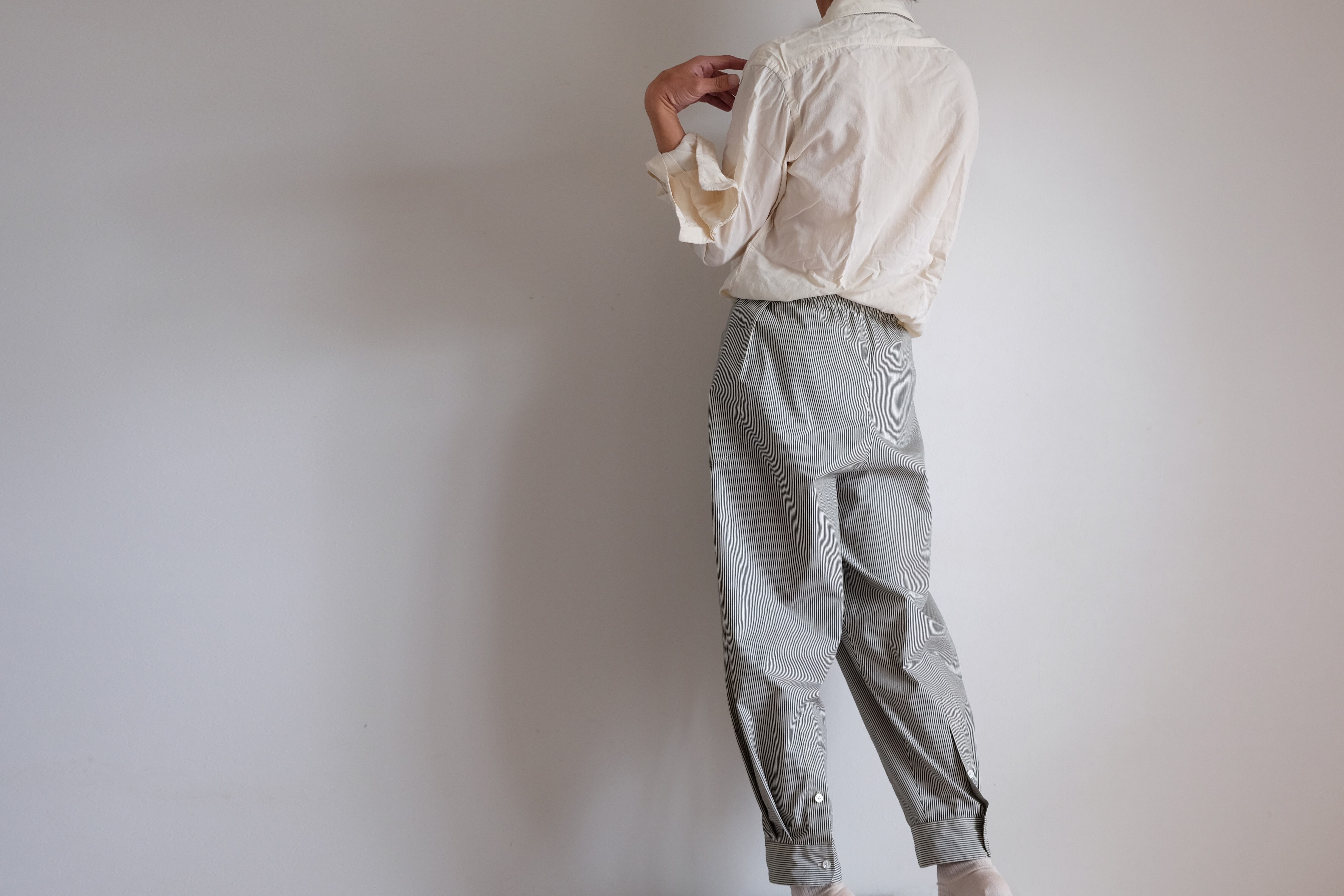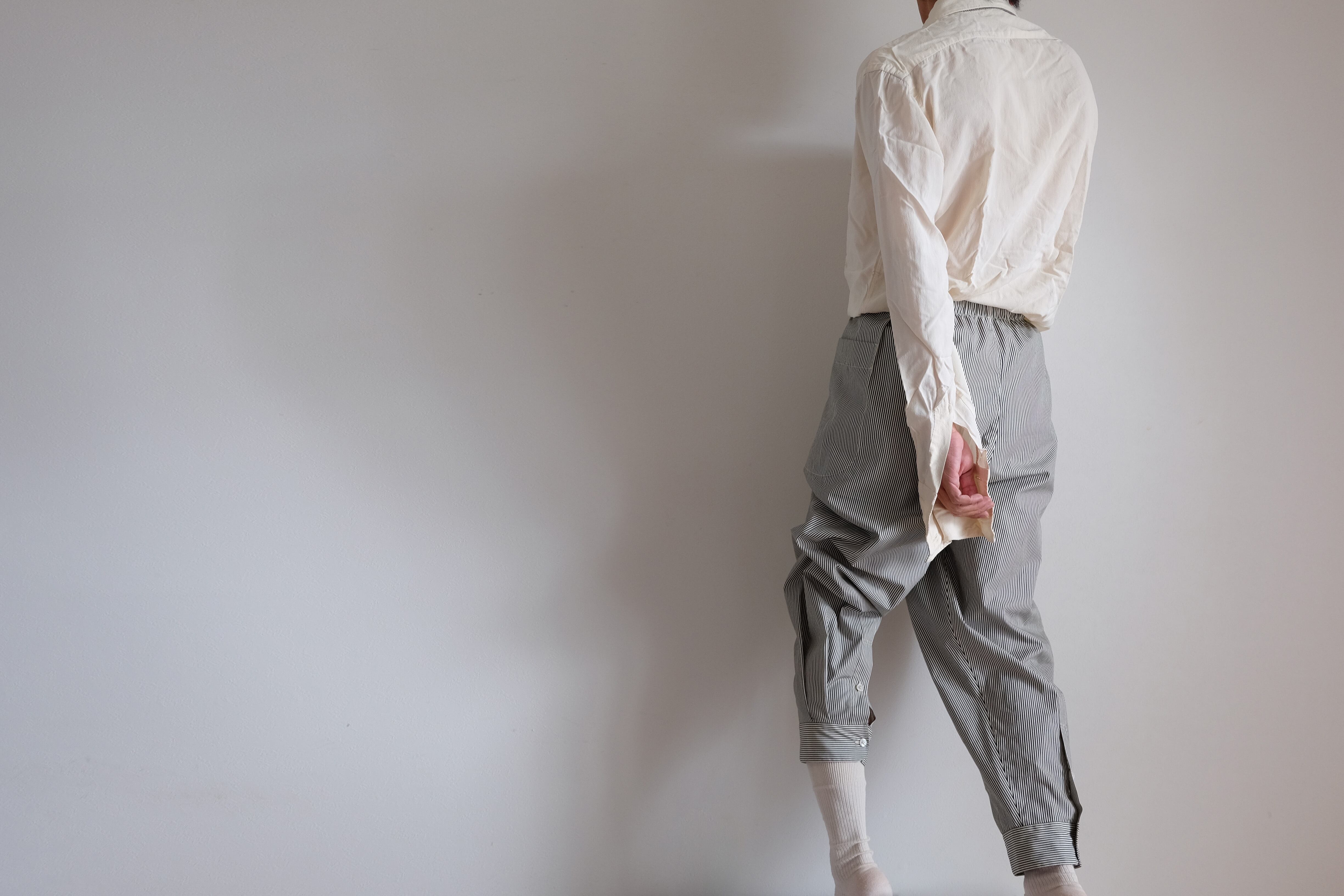 カフボタンの留め外しや、狭い裾をふくらはぎの止まる位置まで引っ張り上げて間の生地をゆったり余らせるなど、シャツの袖同様の着方で表情の変化も楽しめます。