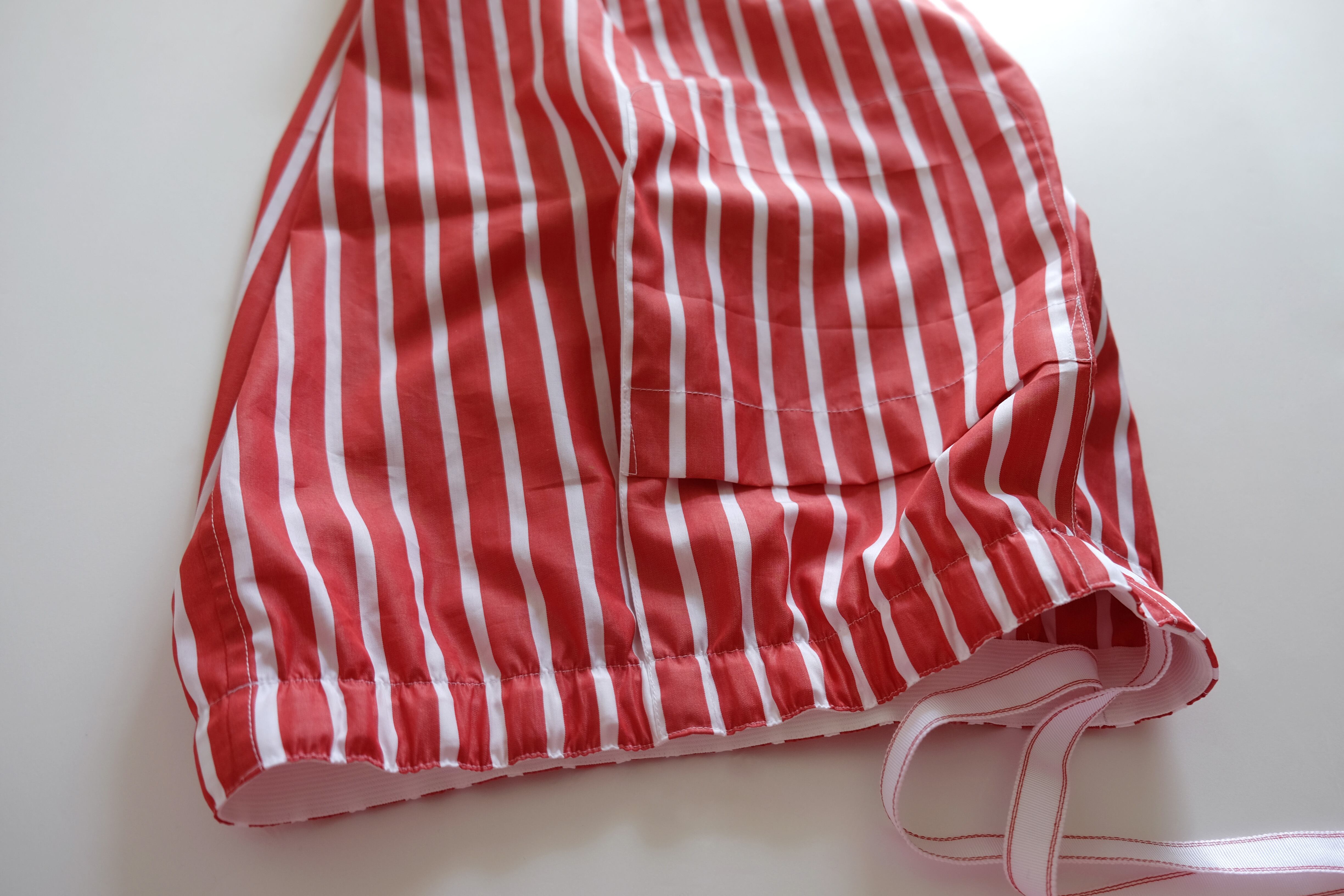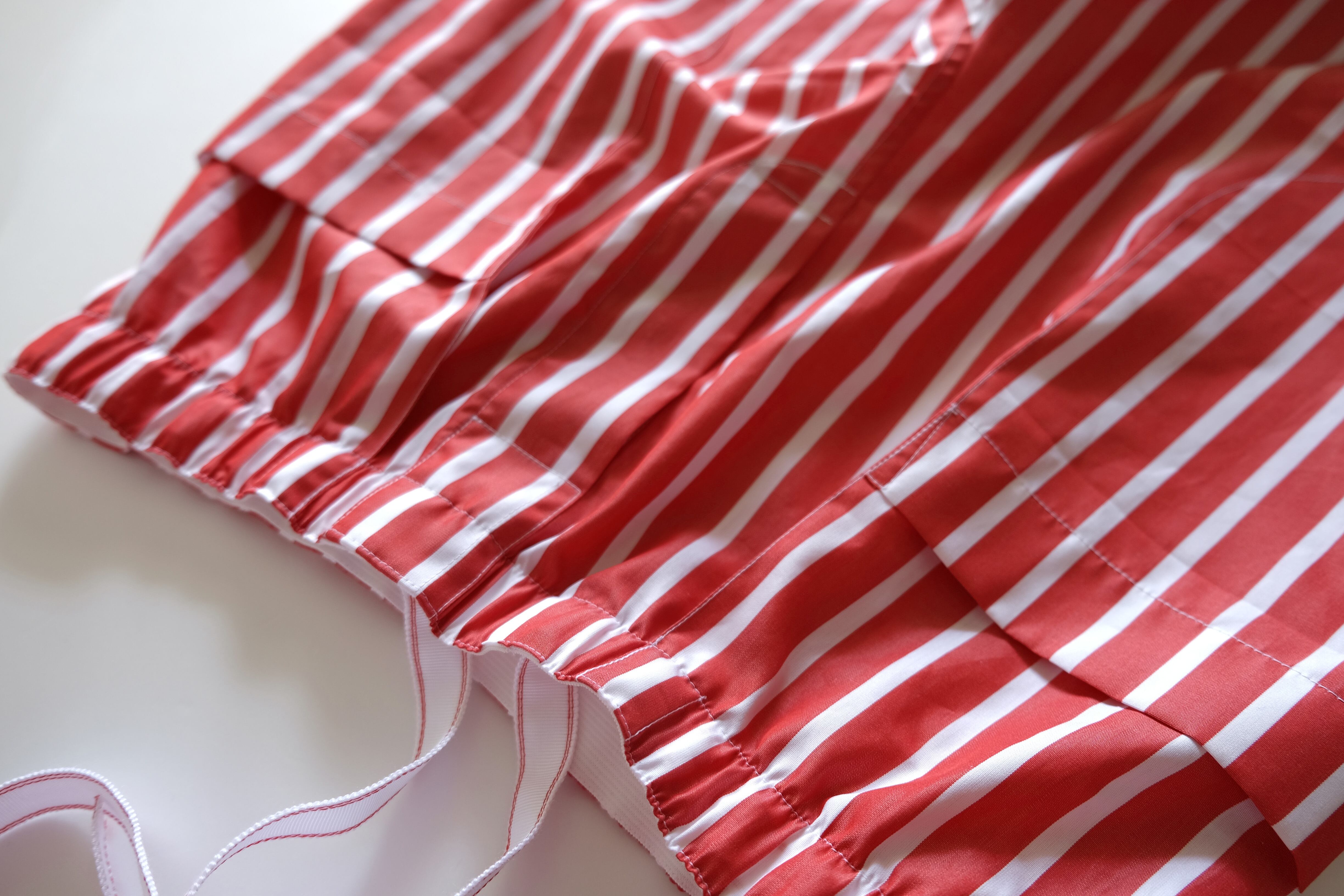 ウエストは、内側に平ゴムを縫い合わせ、更に紐を通しています。